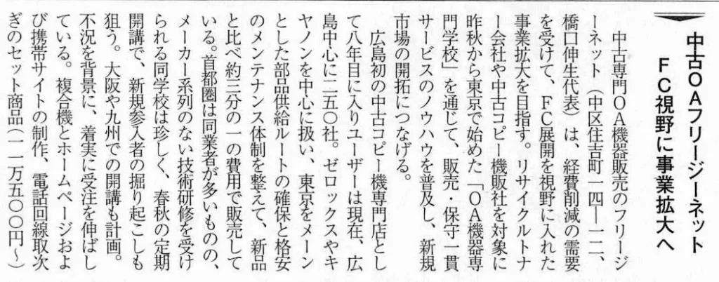 記事タイトル:「中古OAフリージーネット FC視野に事業拡大へ」